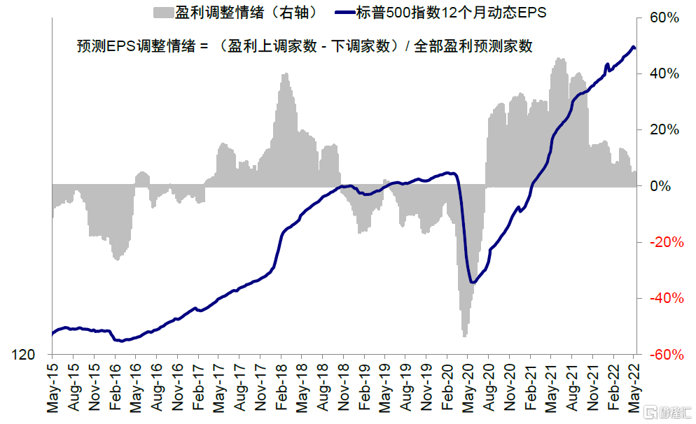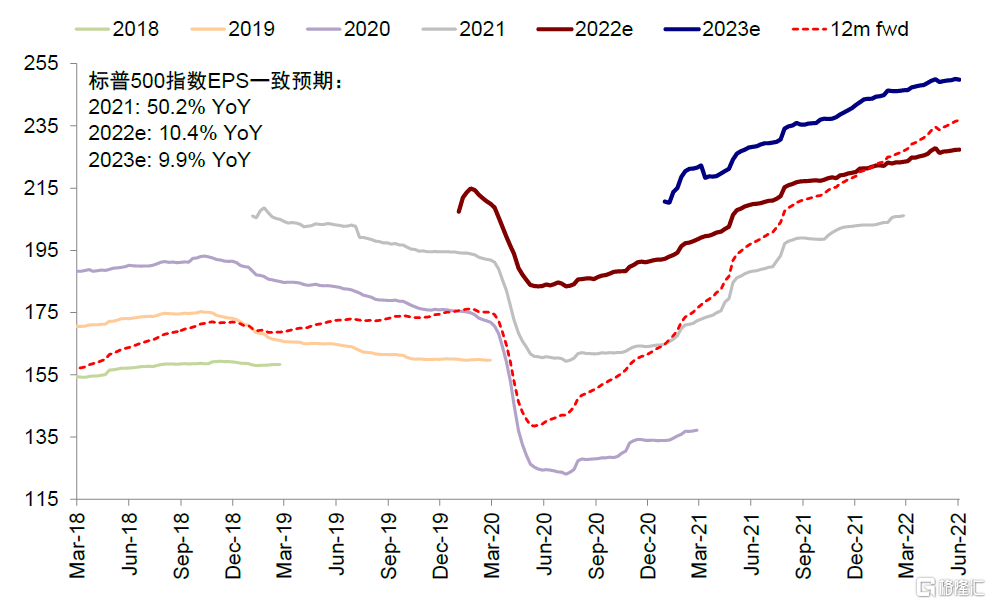 图表38:标普500指数盈利预期依然整体向上,当前2022年预期盈利增速10.4%
