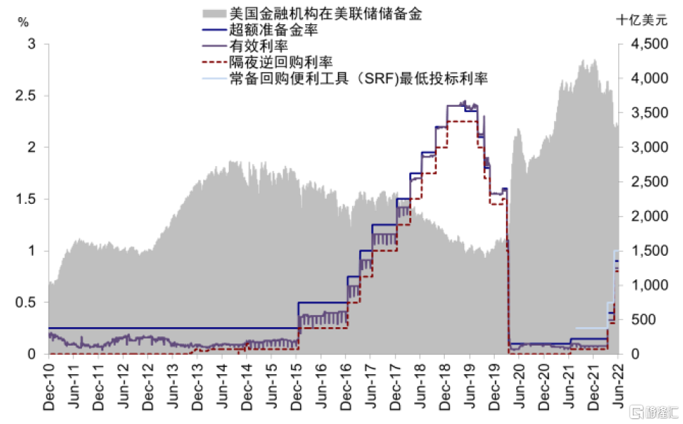 美联储加息时通过设定利率走廊(上沿为超额准备金率IOER,下沿为隔夜逆回购利率ON RRP)来使得联邦基金有效利率(当前为0.83%)锚定在FOMC会议决定的联邦利率水平区间内。具体操作上,纽约联储通过公开市场操作影响央行与主要商业银行与一级交易商等的资金拆借成本,进而影响一级交易商与其他金融机构的拆借成本(如FRA-OIS利差)、再传导至与其他非金融机构和个人的融资成本(如商业票据、贷款、MBS和信用债等等)。因此可以发现,美联储的货币政策影响是从金融体系到非金融体系、利率曲线上从短端到长端逐渐传导。当然,除了价格上的操作外,量的操作(如QE开启或者减量)也会通过国债和MBS的供求关系来影响利率走势。