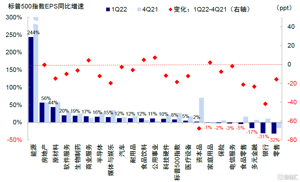 图表34:一季度能源、房地产及原材料一季度EPS同比增速相对领先,但零售、银行、多元金融相对落后