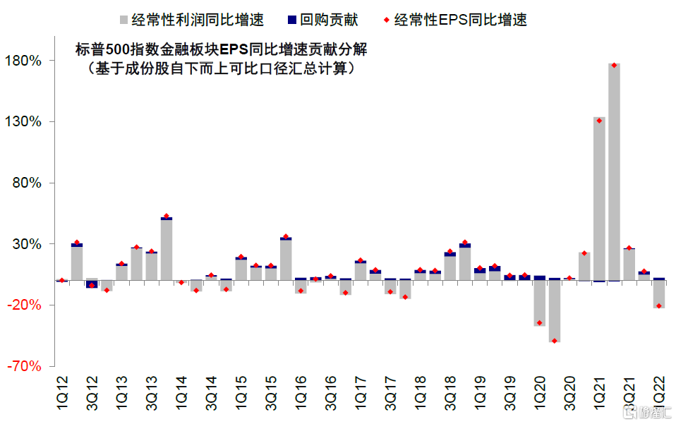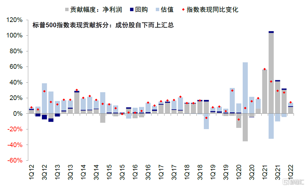 类似上节中方法,首先,从整体指数层面粗略估算,2012年一季度至2022年一季度,标普500指数上涨221.7%,扣除EPS增速(108.3%),隐含估值扩张54.4%,而回购对市场表现的贡献约6%左右。进一步,我们仍然基于指数成分股从自下而上角度进行汇总测算,结果显示,过去10年,标普500指数股价季度平均同比增速约15.1%,其中经常性净利润平均同比增速7.5%、回购约0.8%,其余为隐含估值贡献。平均来看,回购对每季度市场表现的贡献约5%左右。
