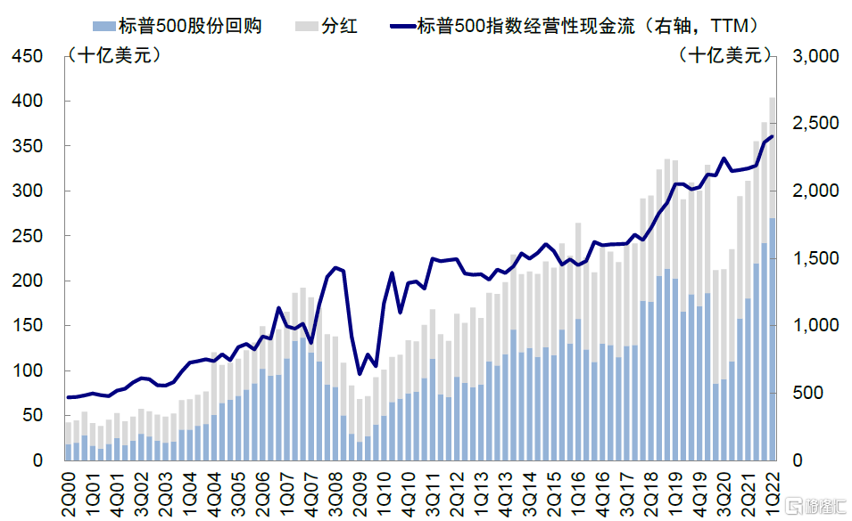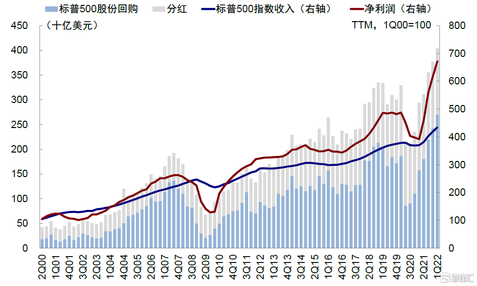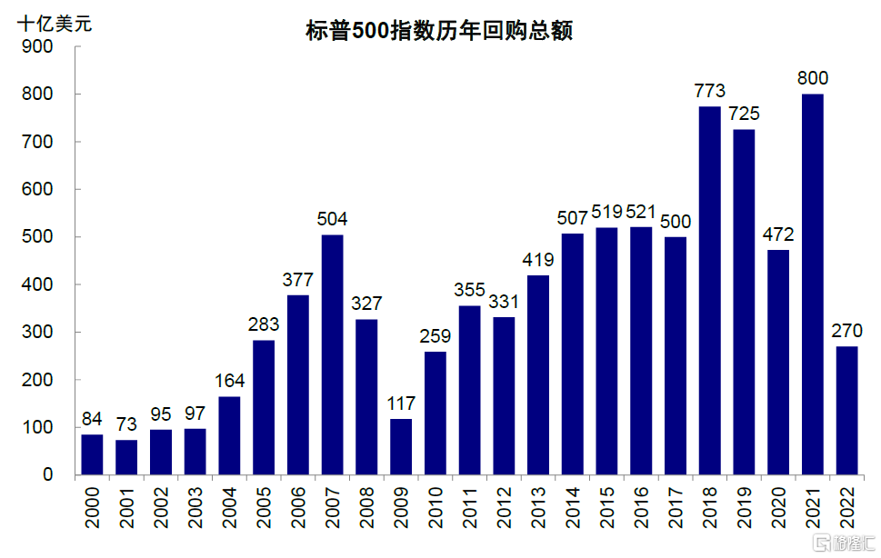 2010年后至疫情爆发前,美股年均回购规模~4910亿美元,占美股总市值的~2.7%。2018年,特朗普税改促使美国企业海外资金大量回流,推动回购规模激增(回购规模从2017年的~5000亿美元攀升至2018和2019年的7000亿美元以上)。疫情后由于美股盈利大幅下滑,回购于2020年大幅回落(~4720亿美元)。但2021年随着现金流和盈利的逐步修复,叠加美联储宽松提供的充裕流动性,企业回购也逐步修复,全年回购规模~8000亿美元,超过特朗普税改后2018~2019年的平均水平(~7490亿美元)。