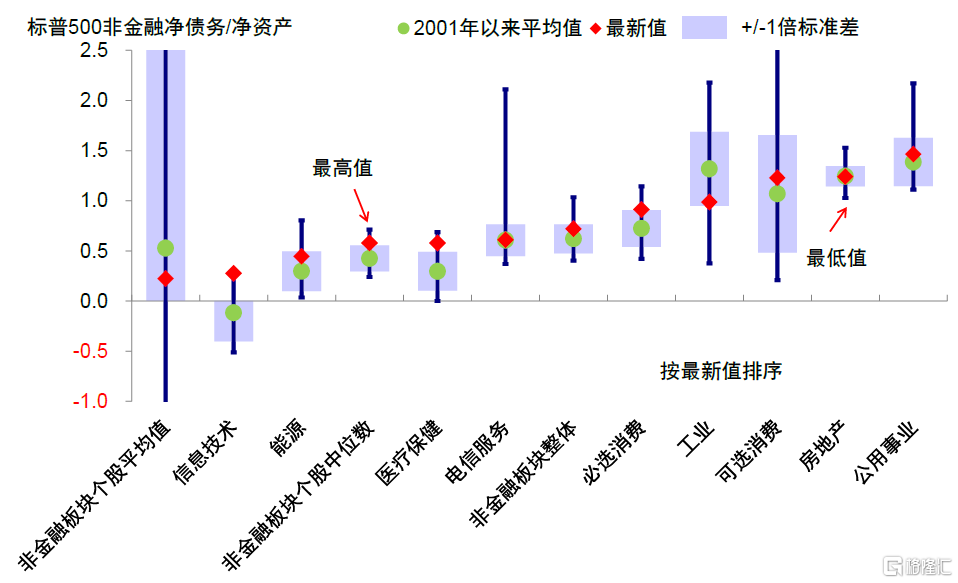 此外,板块内部分化较为明显。通过计算各板块回购及分红超过自由现金流的公司数占各板块公司数的比例来看,工业(14.7%)、可选消费(13.8%)、公用事业(12.9%)比例较高。而上述行业的整体净杠杆率(净债务/净资产)及有息负债/EBITDA同样处于较高水平。相比之下,信息技术及医疗保健,作为美股市场回购的主力军,其利润分配超过自由现金流的公司占该行业比例仅5.2%。