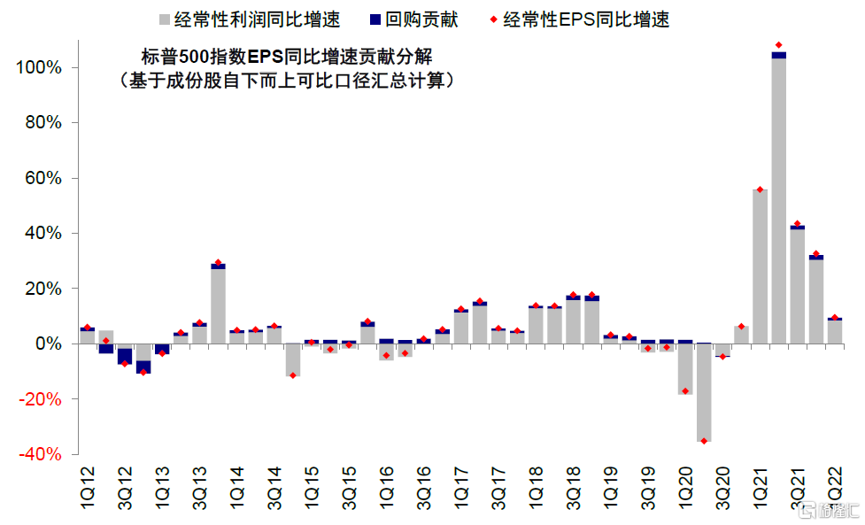 进一步的,为了提高测算的准确度,我们基于指数成分股从自下而上角度进行汇总测算,具体方法是:1)以标普500指数为分析对象、使用最新成分股并假设成分股维持不变以保证计算口径可比;2)以每一期分子的股本数不变作为分子分母的加权因子,来计算经常性EPS的同比增速;这与同期经常性利润同比增速之差作为回购对EPS贡献的近似。