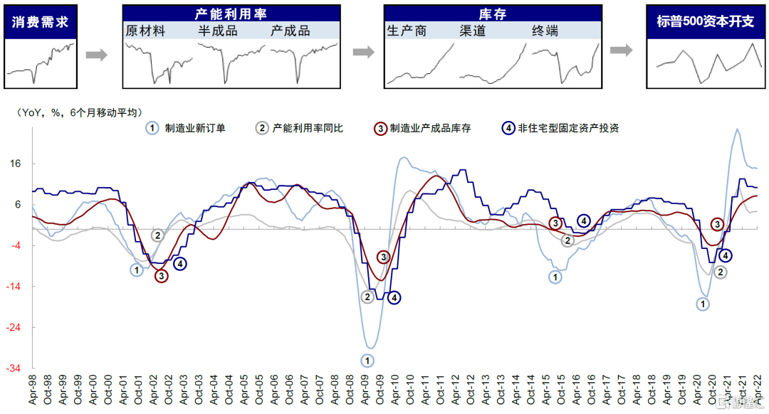 往前看,资本开支周期能否开启也是判断后续企业回购意愿的一个主要维度。如我们在《资本开支周期走到哪了?海外资产配置之投资周期(3)》中所述,我们将企业是否增加投资的决策因素归纳为三个层次:即是否有意愿(需求强弱和库存高低)、是否有需要(内生变量如产能利用率的高低、外生变量如政策要求或新的产业趋势驱动)、以及是否有能力(投资回报率与融资成本、杠杆水平、现金流与在手现金)。从各环节关系看,大体存在需求>>产能>>库存>>投资的传导链条:1)需求:最主要动力,新订单和企业收入大体上领先投资3~6个月,现在基本具备;2)产能利用率:变化领先投资2个月,但绝对水平一般超过77%才会推动投资出现超过平均趋势的增长,目前看美国整体产能利用率约78%但上游产能利用率仍未修复到疫情前水平;3)库存:与投资反向,一个大周期中嵌套若干个小库存周期,现在尚不具备;4)投资能力上,杠杆率落后于投资,在手现金领先投资约1年,现在基本具备。