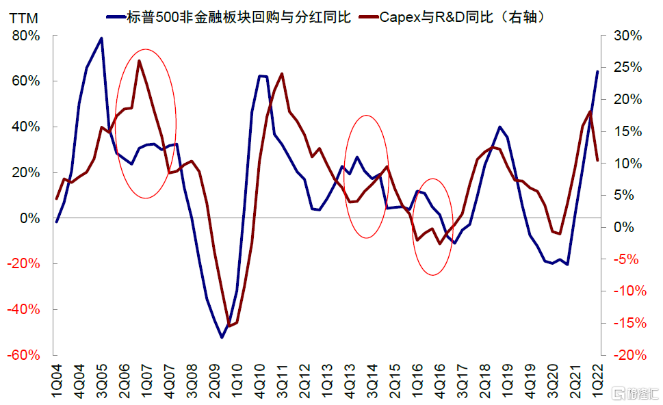 再次,企业资本开支回落,尚未对回购造成挤压。投资需求较弱时,对应回购可能相对增多。不过一季度,美股资本开支总规模有所回落,主要是由于库存和产能利用率的条件还不完全具备、甚至局部已经出现了库存“过剩”的迹象。往前看,由于现在需求趋弱、金融条件收紧,反而可能进一步抑制企业资本开支的意愿。这一点可以促使企业更多转向分红回购,但或难以完全抵消前两个因素的影响。
