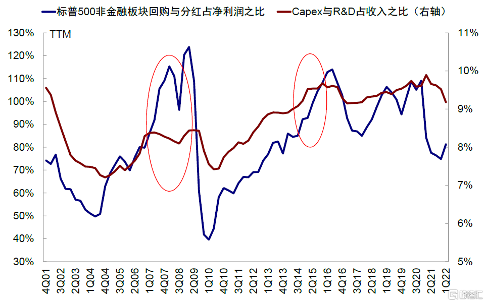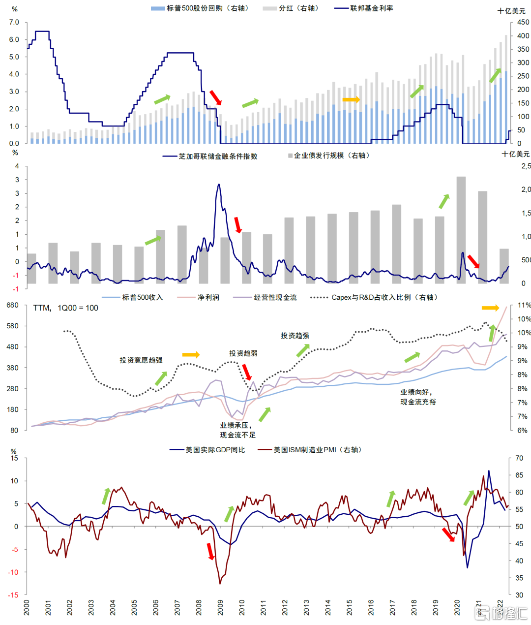 如我们在第一章所述,如果不考虑企业盈利这一变量,投资需求相对较弱的时候,对应回购可能相对增多。美联储货币政策收紧的确会使得上述的企业融资成本抬升(企业信用利差走扩),这对投资需求会造成一定程度的下行压力。