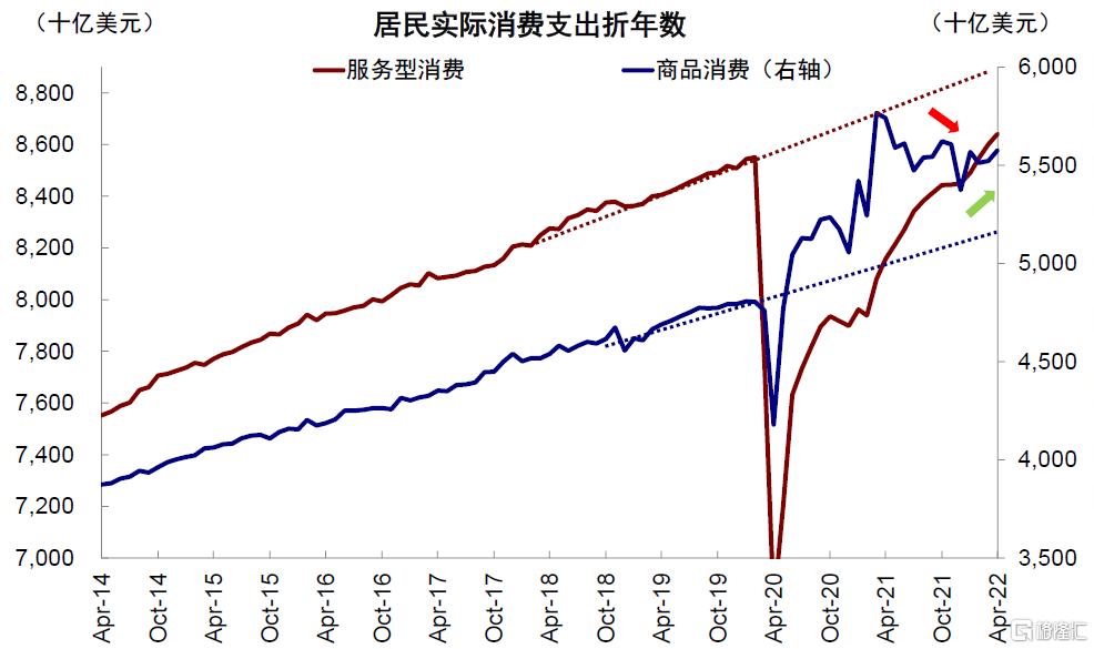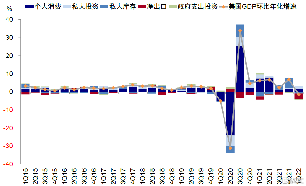图表42:一季度美国GDP季调环比折年率-1.4%,净出口拖累但内需仍相对强劲