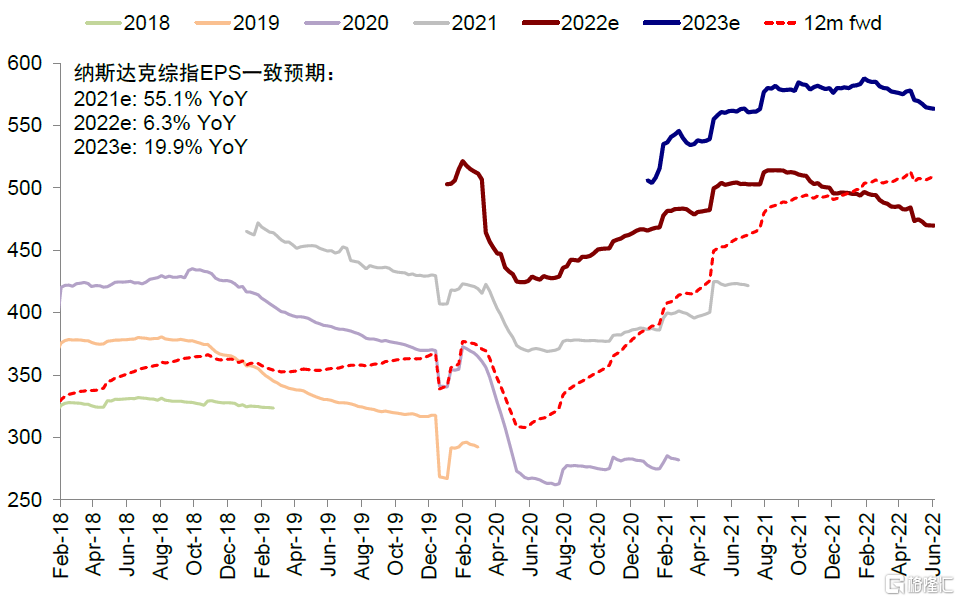 图表39:纳斯达克综指盈利增速自去年三季度高点后逐步下调,当前2022年预期盈利增速6.3%
