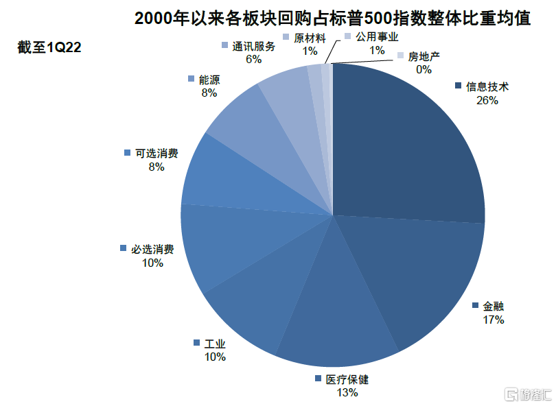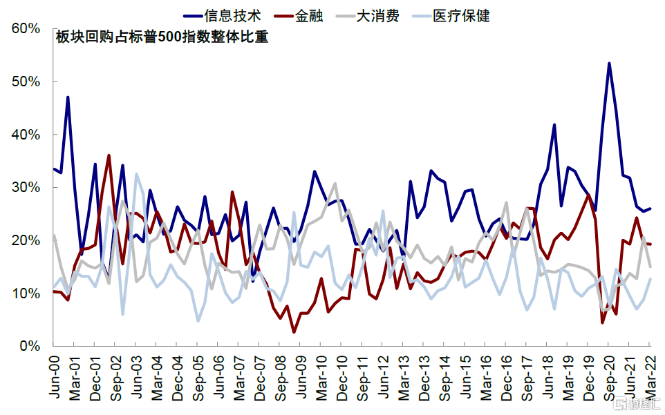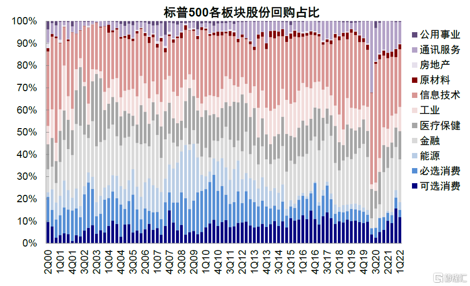 板块上,信息技术占比最高,2000年以来回购金额平均占指数整体的26%,2020年三季度末这一比例一度抬升至54%,随后虽有所回落但截至2022年一季度末,仍维持在26%的均值水平。此外,金融及医疗保健板块回购平均占整体的17%和13%。相比之下,房地产、公用事业、原材料等板块回购则相对并不活跃,平均占比不足2%。