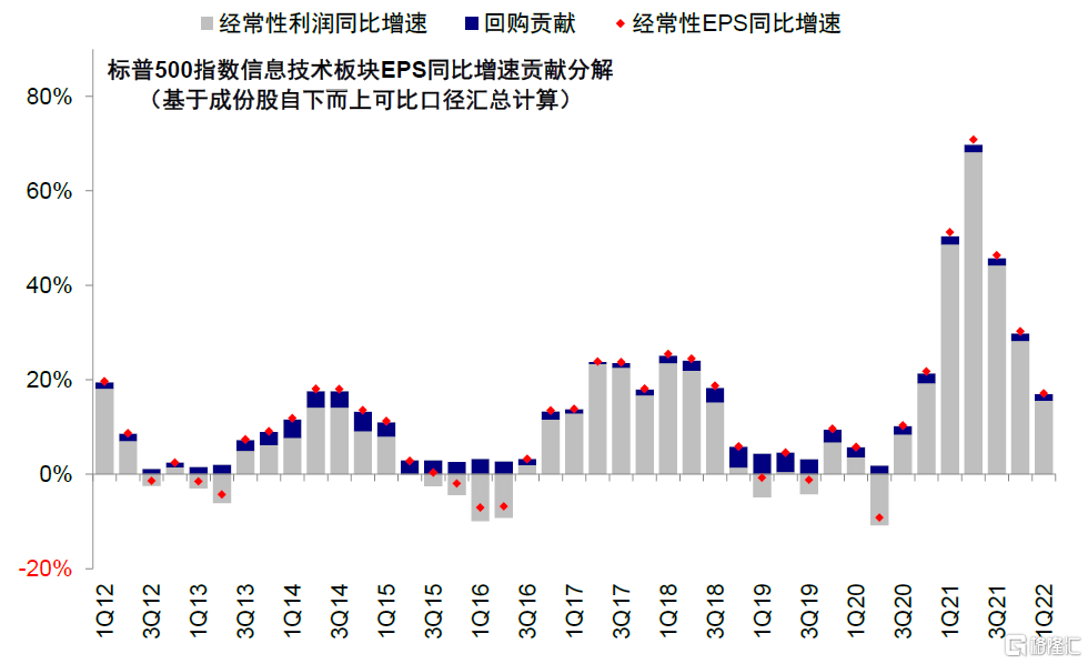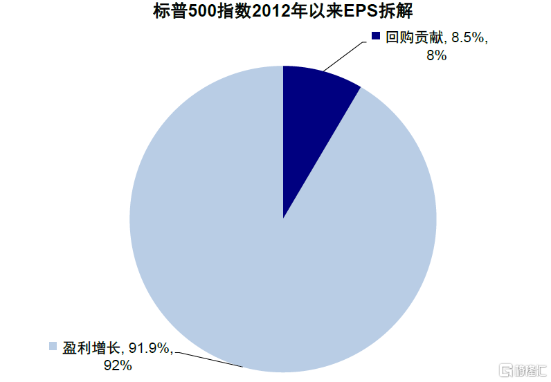 首先,从整体指数层面粗略估算,2012年一季度至2022年一季度,标普500指数EPS累计增长108.3%,同期净利润涨幅为91.9%,二者之间8.5%的差距可以近期视作股份回购带来的增厚效果(贡献幅度约8%)。