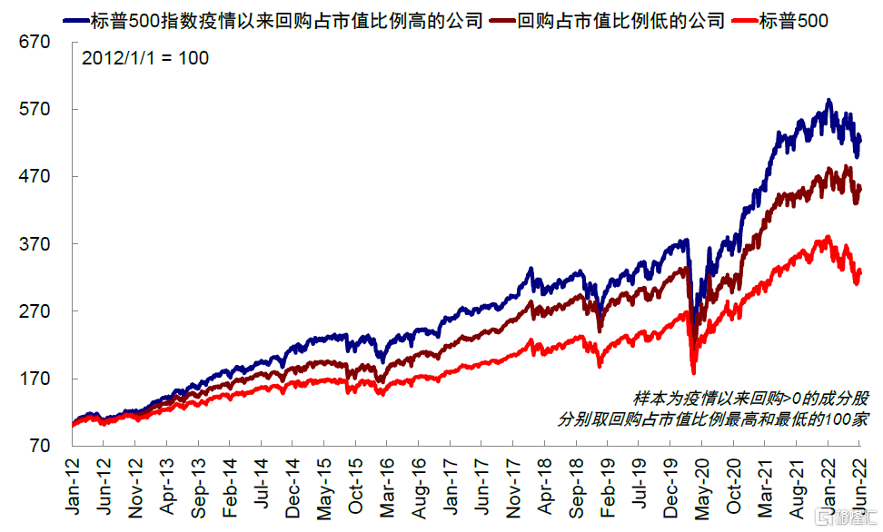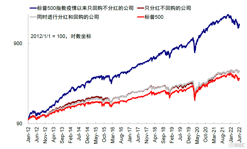 我们同样基于指数成分股从自下而上角度进行汇总测算,具体方法和过程是:1)以标普500指数为分析对象,筛选出疫情以来只进行回购的成分股、只进行分红的成分股、以及同时进行回购和分红的成分股;2)针对进行回购的成分股,进一步筛选出回购占市值比例最高的前100以及最低的前100;3)针对上述成分股进行指数组建(等权重)。