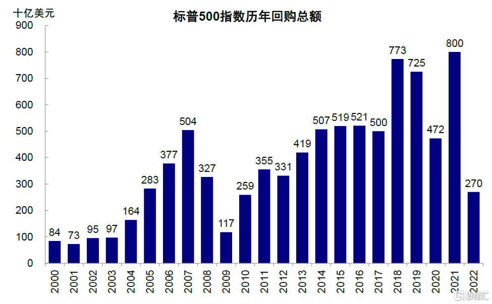 图表19:2020年,受疫情影响,回购规模大幅回落(~4720亿美元),但2021年再度攀升至~8000亿美元的历史高位