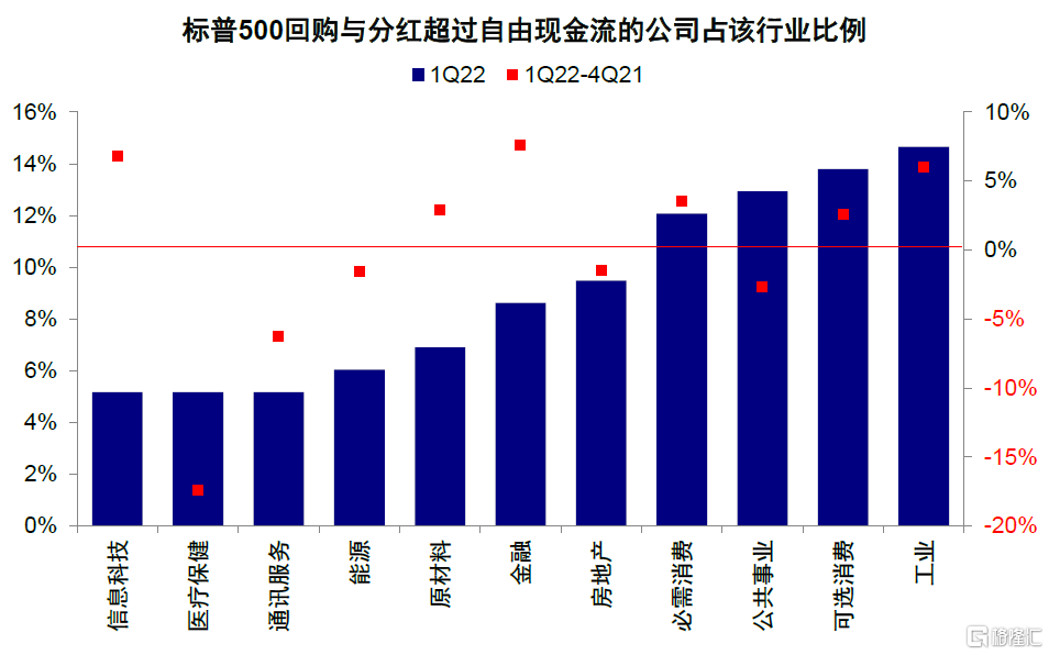 从标普500回购与分红超过自由现金流的公司占该行业比例来看,如第一部分所述,更多依赖外部融资(杠杆率偏高)的工业及可选消费板块一季度比例较前一季度有所抬升(工业板块抬升6%、可选消费板块抬升2.6%),与此同时,在手现金及现金流更加充裕的信息科技板块及金融板块,由于一季度业绩大幅回落,回购与分红超过自由现金流的公司占该行业比例同样出现抬升(一季度较去年四季度抬升分别抬升6.8%和7.6%)但仍处行业相对低位。