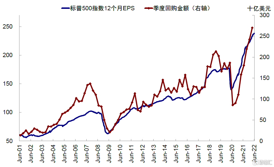 整体来看,回购的确不是EPS增长的主要贡献。过去10年,标普500指数经常性EPS季度平均同比增速约8.3%,其中经常性净利润季度平均同比增速约7.5%、回购约0.8%,回购对EPS每季度的平均贡献约10%。具体来看,2018年后虽然回购规模得益于税改后海外资金回流推动而显著增加,但上述贡献拆解显示,回购对EPS增速的贡献却并不显著,受税改后需求向好、企业增加投资等多方面因素的提振,2018年每季度平均经常性EPS同比增速约15.8%,净利润增速约14.3%,回购仅1.5%,贡献幅度约10%左右。2021年亦是如此,受疫情后低利率环境及数轮财政刺激影响,美股企业盈利能力快速提振,2021年季度平均经常性EPS同比增速达60.1%,净利润增速达57.7%,回购仅2.4%,贡献幅度约4%左右。