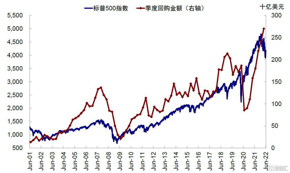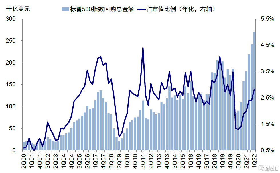 大量且持续的回购是美股有别于全球其他市场的鲜明特征,企业通过回购增厚EPS的同时也有助于提振情绪。以标普500为例,继2021年回购达到创纪录的8000亿美元(市值占比2.0%)后,2022年1季度再创历史新高。近期,受紧缩和衰退担忧影响,美股持续回调,美联储也进入“紧缩快车道”,市场担心这会抑制美股回购能力,进而使得美股在估值和盈利承压的情况下失去“最后的依靠”。那么是否果真如此,加息又如何影响回购?回购对美股影响又有多大?