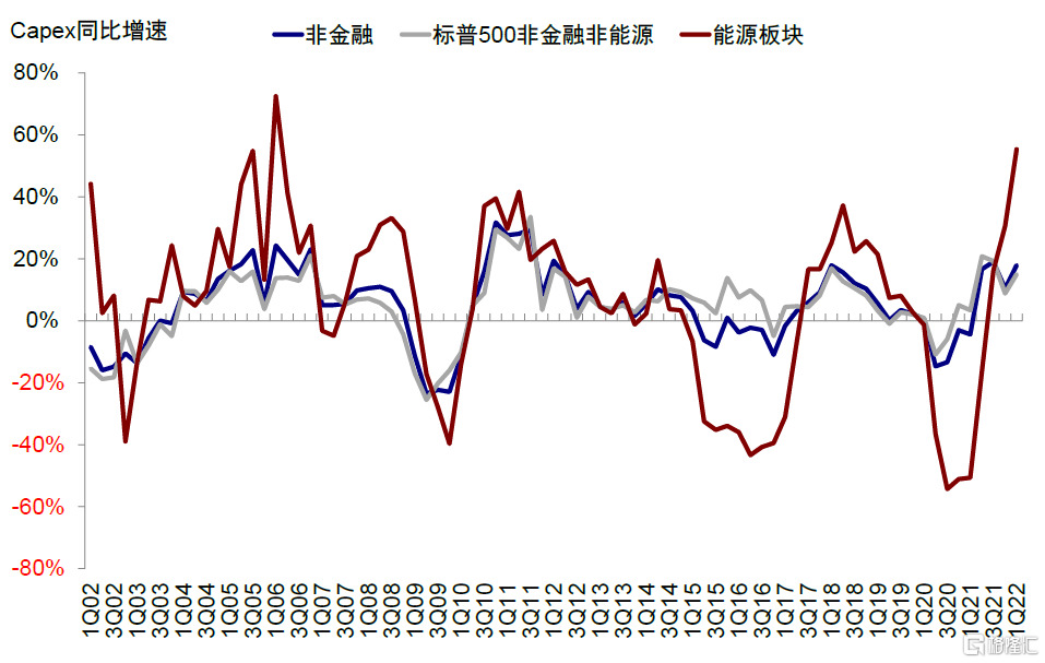 图表47:一季度标普500能源板块Capex同比增速继续抬升至55%,非金融非能源板块抬升至15%