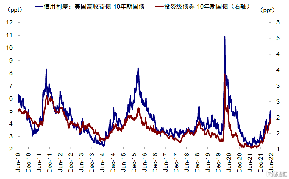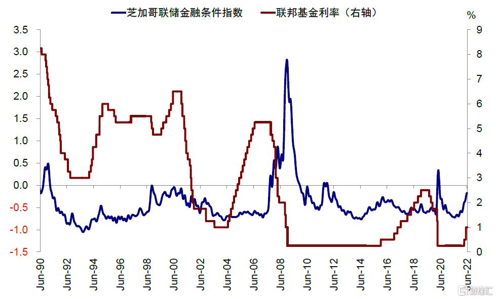 我们认为短期盈利下滑的压力的确存在,但衰退担忧也可能被龙头公司效应所放大,距离实际衰退还有距离。近期盈利的压力可能来自中国局部疫情复发扰动带来对于增长和供应链的担忧、同时通胀居高不下也对企业成本端产生压制。诚然,这些压力在短期内仍将继续存在。不过,从实际的增长情况来看,美国在本轮疫情后消费、生产活动和就业都有不错的修复,例如4月零售销售环比抬升0.9%,3月环比从0.5%大幅上修至1.4%;4月工业产出持续修复,环比增长0.8%;5月ISM制造业PMI抬升且非农就业修复好于预期;以及一季度GDP内需(个人消费和私人部门投资)加速增长。因此整体而言,虽然增长放缓压力增加,但距离衰退可能还有距离。如我们在2022下半年展望中分析,我们预计金融条件收紧带来的压力可能在年底逼近阈值。