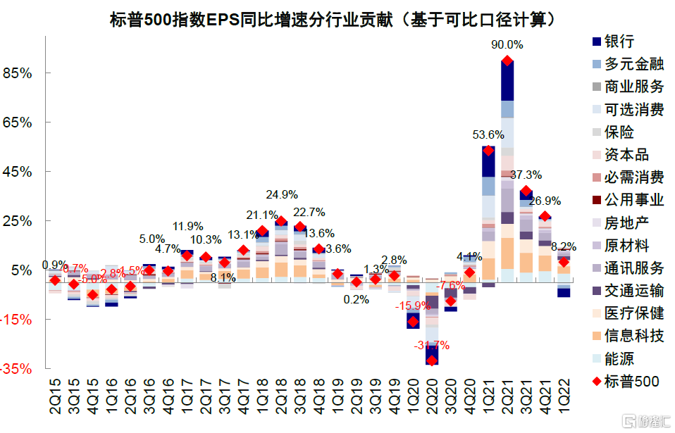 图表35:一季度能源、信息技术、医疗保健及交通运输为主要贡献,银行、多元金融及可选消费有所拖累