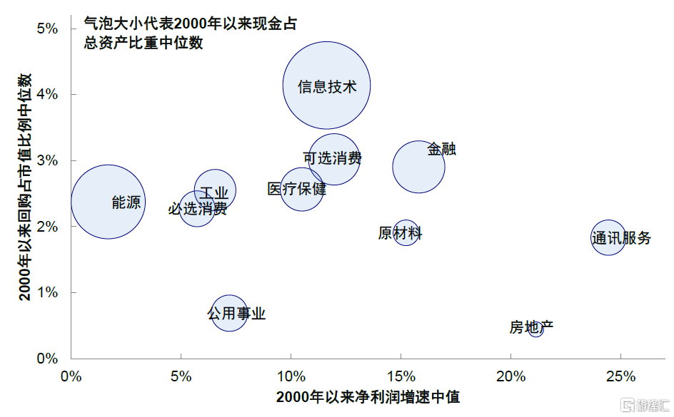 我们在上文中提到的回购“顺市而为”的特点在板块层面的分布规律也可以得到印证。上述回购较为活跃的板块往往也具备盈利增速较高、在手现金充裕的特点。具体来看,2000年以来,信息技术、金融及医疗保健板块净利润增速中值分别达12%、16%及11%,在手现金占总资产比重中位数分别达1.5%、3.2%和1.6%,均处于板块前列,较高的盈利增速和宽裕的在手现金一定程度上支持了这些板块成为美股回购的“主力军”。