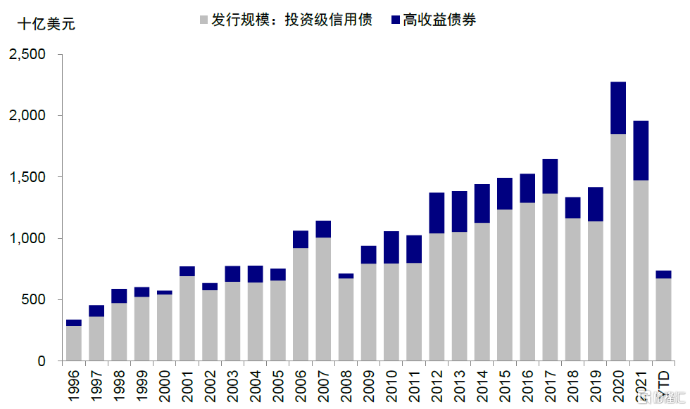 图表11:2020年企业债发行规模达1.85万亿美元,创历史新高,2021年虽有所回落,但仍达1.47万亿美元