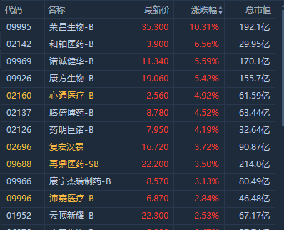 港股医药股集体爆发,荣昌生物涨超10%,百济神州涨12%,微创机器人涨12%,信达生物、微创医疗等涨10%。浙商证券表示,从企业价值倍数全球比较看国内CXO投资性价比我们认为,参考海外CXO龙头估值水平,目前国内CXO行业估值已经见底,投资性价比较高。