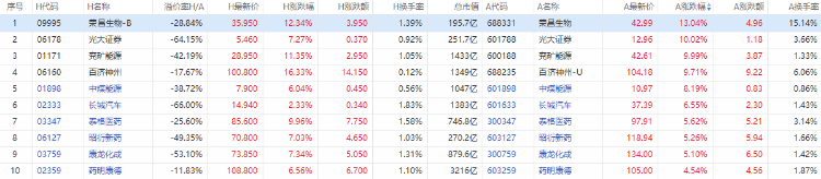 截至发稿,荣昌生物A股涨13.04%,H股涨12.34%;光大证券A股涨停,H股涨7.27%;兖矿能源A股涨停,H股涨11.35%。