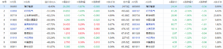 海尔智家A股跌2.25%,H股跌1.87%;时代电气A股跌2.16%,H股跌1.69%;新华制药A股跌1.90%,H股跌1.47%。