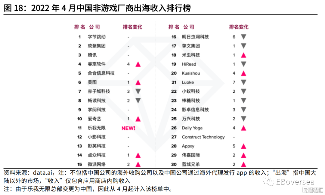 根据data.ai数据,22年4月非游戏厂商出海头部稳定,腰部厂商排名变化相对较大。其中字节跳动、欢聚集团和腾讯稳居22年4月非游戏厂商出海收入Top3,与22年3月相比无变动。睿琪软件环比上升4位至第4名,主要由于旗下识别植物产品PictureThis在欧美市场的高增长。第5、6名分别为合合信息科技和美图。