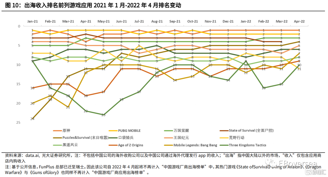 2022年4月,data.ai游戏出海应用收入榜单中,头部游戏排名保持稳定,腰部竞争趋激烈。收入排行前三名为米哈游《原神》、腾讯《PUBG MOBILE》和莉莉丝《万国觉醒》,与22年3月相同。由于FunPlus总部搬迁,《State of Survival》不再计入排名,三七互娱旗下《Puzzles & Survival》前进一名至第四名。