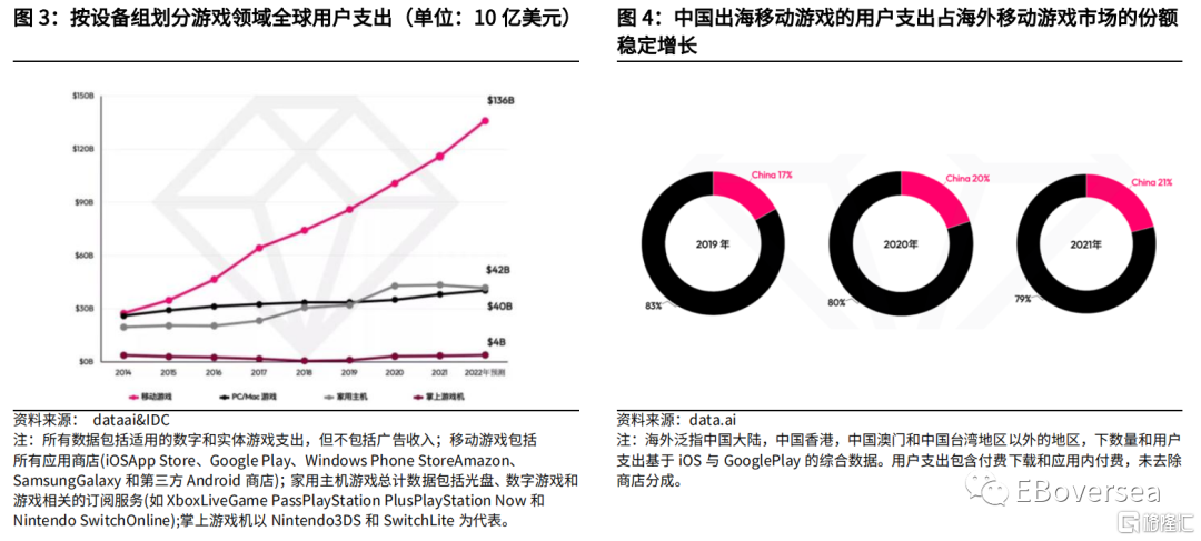 全球移动游戏行业前景广阔,国内游戏海外收入份额稳定增长。根据data.ai与IDC联合发布的2022最新游戏市场报告预测,2022年全球移动游戏市场将突破1,360 亿美元,比游戏市场整体增长快1.7倍。其中,中国游戏在海外的市场占有率稳定增长。根据data.ai数据显示,2019-2021年,中国出海移动游戏的用户支出占海外移动游戏市场的份额呈逐年上升趋势,分别为17%、20%和21%。