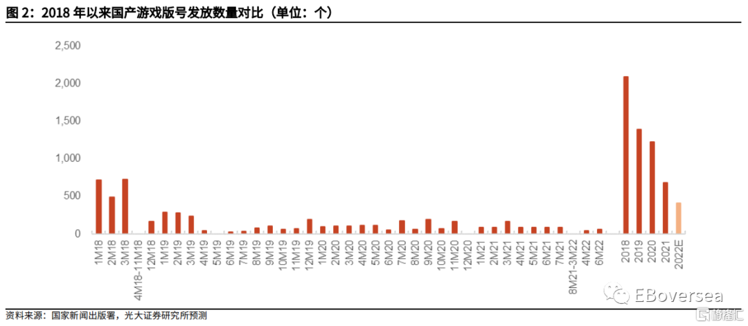 从版号发放数量来看,此次国产游戏版号获发60个,数量高于22M4的45个,整体仍符合总量管控原则。历史上看,若将同款产品在不同终端的版号计为一个版号,2018年3月份之前,版号政策较为宽松,2017年共发放国产游戏版号9177个;此后管控态度明确,2018年回落至2091个,2021年仅为679个;每月发放数量虽有波动,但参考2020年1-5月与2021年1-7月数据,可以看出常态化下每月版号发放数量从105个减少至86个左右,未来版号或将成为稀缺资源。我们认为,22M6版号继续发放,后续版号监管有望常态化,版号有望逐月稳步发放。我们预计22年后续每月维持50款左右游戏版号下发,全年预计发放405个版号左右,较21年下降40%。
