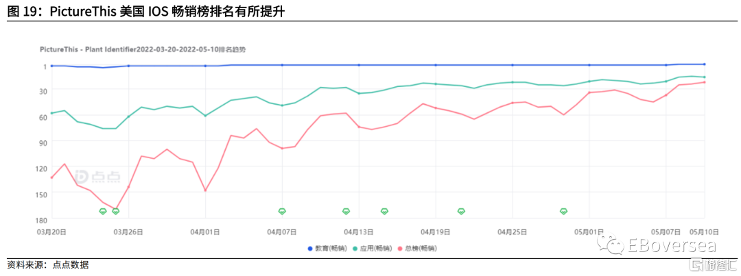 睿琪软件在收入榜中跃升到第4名,主要由于旗下PictureThis在北美、西欧市场所获的高增长。睿琪软件以做会声会影等图像及视频处理软件起家,随后成长为专注于计算机视觉的软件公司,PictureThis是其ToC端的旗舰产品。在22年4月data ai中国非游戏应用出海收入排行榜中,PictureThis收入排名上升5个名次,进入前三。