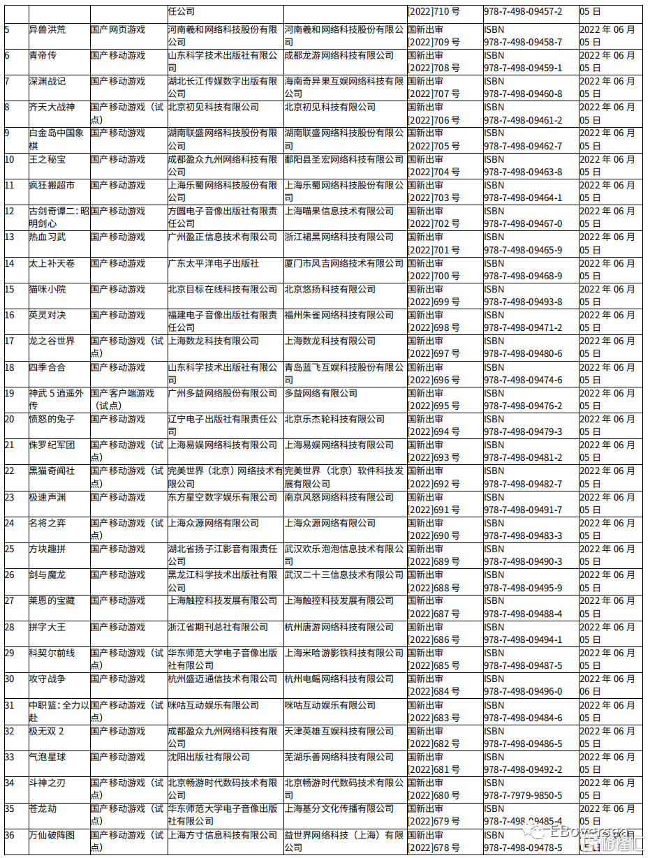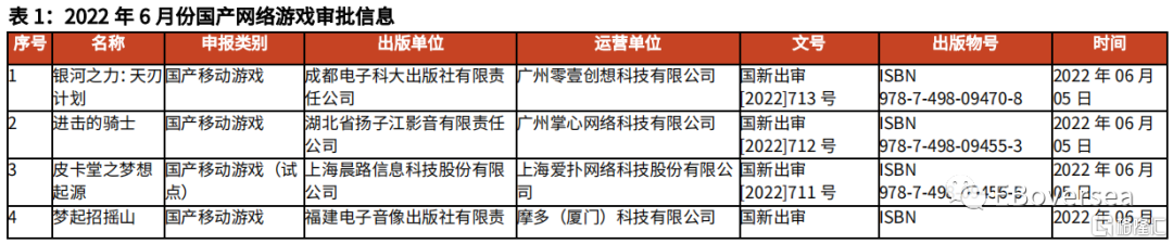 事件:22年6月7日,新闻出版总署正式发布22年6月份国产网络游戏审批信,共60款游戏获发版号,这是继22年4月版号重启下发以来的第二次发放。完美世界、米哈游、电魂网络等厂商此次获发版号。本轮涉及获批游戏包括完美世界女性向卡牌游戏《黑猫奇闻社》、米哈游《科契尔前线》、电魂网络《跃迁旅人》、上海喵果《古剑奇谭二:昭明剑心》等知名作品,IGG旗下福州天盟、英雄互娱、浙数文化旗下边锋网络、中国移动旗下咪咕互动、搜狐旗下畅游也都获得了版号。