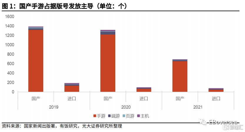 从版号发放结构来看,此次版号发放以国产手游为主导。22年6月下发的60款版号中,仅有1款网页端游戏和1款客户端游戏,其余58款游戏皆为移动端游戏,手游版号占所有版号的97%。历史上看,若将同款产品在不同终端的版号分别计算,2019-2021年国产手游分别获发版号1323/1225/658个,且占所有版号的比例稳定在85%左右;进口游戏版号发放逐渐收缩,2019-2021年分别有185/97/78款进口游戏取得版号;页游逐渐退出审核,2021年仅有4款过审,这与页游市场逐渐萎缩的趋势一致。