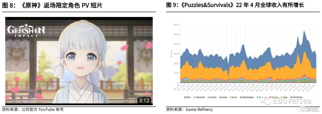 1)米哈游出海收入稳居榜首,《原神》维持畅销优势。2.6版本更新后,凭借受到好评的新地图、新限定角色及热门限定角色的返场,《原神》的热度进一步提升。同时,该游戏在海外发达市场收到欢迎,根据Game Refinery估计,该游戏2022年4月日本市场及美国市场营收占比分别为39.7%、26.7%。