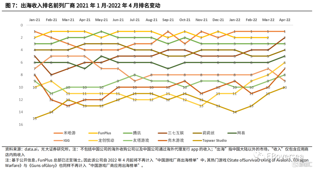 3.1、出海游戏厂商:头部厂商位置较稳定,三七互娱表现亮眼