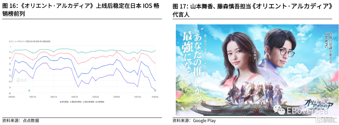 阿里巴巴旗下灵犀互娱推出《三国志幻想大陆》日服版本《オリエント·アルカディア》,在日本市场收入表现较佳,并跻身2022年4月中国手游海外收入增长榜单第7名。1)游戏于22年4月9日正式登陆日本市场,首发后随后稳定在日本地区IOS冒险类游戏畅销榜10名左右。2)该游戏发力本地化运营,登陆日本后选择淡化三国标签、放大东方幻想元素,游戏美术和配乐在贴合日本传统二次元风格的同时保有“国风幻想”感。3)高频曝光,游戏预热效果良好。《オリエント·アルカディア》提前一个月起释出角色PV和声优采访视频,并通过明星代言和举办创作活动获得大量曝光。该游戏预热取得良好效果,截至4月9日上线前预约人数超50万。4)《三国志幻想大陆》有望与主打历史写实风格的《三国志·战略版》形成互补,进一步完善灵犀互娱出海产品布局。