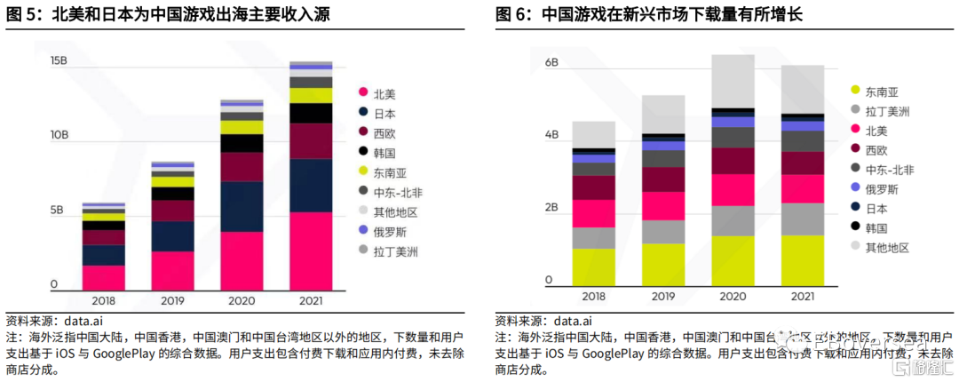北美、日本仍是国内游戏出海主要市场,东南亚、拉美等新兴市场未来可期。(1)美国、日本等成熟市场仍是中国游戏出海的主要收入源,根据中国音数协游戏工委的报告,2021年中国自主研发游戏海外收入中,来自美、日、韩市场的收入占比分别为32.6%、18.5%和7.2%。但2019-2021年三地占比合计逐年下降,我国游戏产业正探索新兴市场,拓展海外市场的广度。(2)东南亚、拉美等新兴市场整体数字化格局正迅速发展,存在大量待发掘的智能手机用户,有望拓展中国游戏厂商出海的增长空间。根据data.ai数据显示,2018年以来,中国游戏在东南亚、拉丁美洲等新兴市场下载量有所增长。根据Sensor tower数据,2021年共48款中国手游入围东南亚地区畅销榜Top100,合计吸金约9.8亿美元,占Top100总收入的54.0%,其中沐瞳科技《Mobile Legends: Bang Bang》与米哈游《原神》表现突出,东南亚21年收入均超过1亿美元。