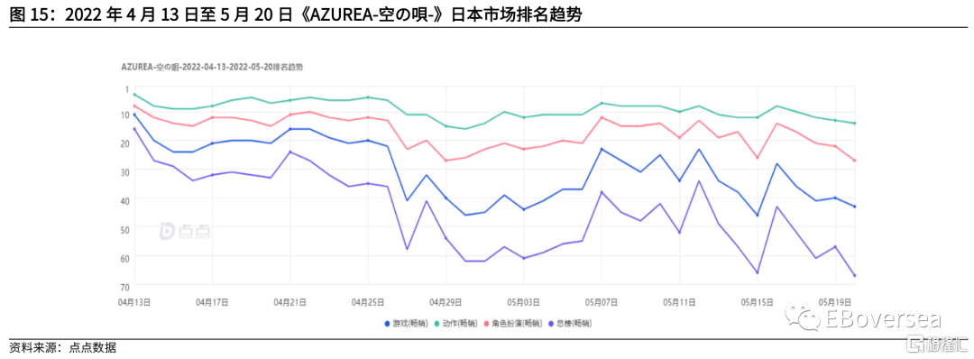 出海游戏新品方面,网易&紫龙游戏《天谕》日服(《AZUREA-空の唄-》)上线,开服后表现抢眼。4月13日,由网易雷火工作室研发、紫龙游戏发行的东方幻想MMORPG手游《天谕》 (《AZUREA-空の唄-》)于日本市场上线。1)品质良好,展现雷火工作室MMO品类优势。《天谕》手游是网易经典IP“天谕”的手游续作,具有高度自由的捏脸系统和独特的开放世界体验。游戏于2021年1月在中国大陆地区上线,根据点点数据,截至2022年5月维持在中国大陆地区IOS角色扮演类游戏畅销榜前100。2)本地化运营成效较为显著。游戏取名“天空之歌”(空の唄),实现了对“天谕”的意译的同时十分贴合日本玩家对幻想系产品的理解,宣发活动也强调游戏的幻想风格。受益于风格化的包装和紫龙游戏在日本市场的运营经验,截至22年4月13日该游戏上线前预约人次达百万以上。3)《AZUREA-空の唄-》开服首周位列日本iOS游戏免费榜榜首、畅销榜TOP20。据Sensor Tower数据,得益于日服卓越表现,22年4月《天谕》手游位列海外收入增长榜第八,游戏海外收入达到3月份的5.5倍,创历史新高,来自日本市场的收入占比超过86%。
