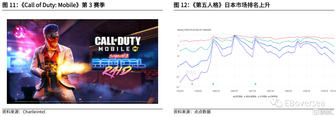 新赛季助推《Call of Duty: Mobile》海外收入高速增长,根据Sensor tower数据,2022年4月该游戏海外收入环比上升40.9%,居中国手游全球收入榜第6。《Call of Duty: Mobile》22年3月30日第三赛季的更新在刷新赛季奖励的同时加入了新地图、新角色、新武器和新游戏模式等大量内容,根据点点数据,赛季更新后该游戏排名有所提升,最高排名为美国IOS动作类游戏畅销榜第一名。