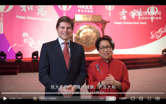 今年2月4日,农历大年初四,港交所内部举办了新春开市仪式,主席史美伦和行政总裁欧冠升一起主持敲锣。随后港交所发布短片,史美伦和欧冠升分别用普通话和英语向公众拜年,短片结尾,两人一起用普通话说:‘恭喜、恭喜!’