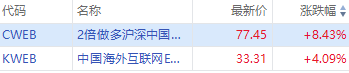 ETF方面,2倍做多沪深中国指数 $CWEB 涨超8%,中国海外互联网ETF $KWEB 涨超4%。
