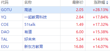 中概教育股表现抢眼,高途 $GOTU 涨超28%,一起教育科技 $YQ 涨超17%,有道 $DAO 涨超15%,新东方教育 $EDU 、好未来 $TAL 涨超14%。