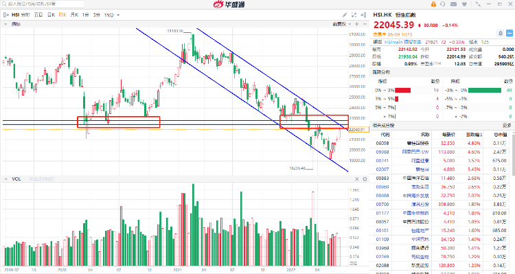 从恒生指数周线图来看,指数走势处于非常“完美”的下行通道中,在触及通道下沿19000点附近支撑后开启反弹,目前距离通道上沿阻力22300附近不远。而此前2020年3月附近的低点现在已经转为阻力,因此指数进一步上升面临双重压力。未来需确认有效站稳23000点上方,才能打开进一步上涨的空间。但这个整数关口料阻力强劲,指数有回撤修整的可能性。