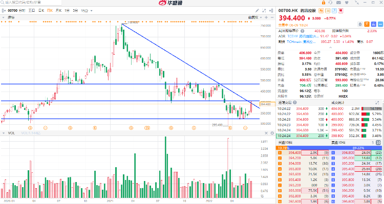 个股方面我们看看“股王”腾讯,显然正受到来自400港元整数关口的强阻力。400关口是此前整理区间的下沿,当前转为阻力,且是下行趋势线所指的阻力位置。若市场缺乏重磅利好因素使得股价有效突破400-410区间,那么短期可能也需要调整蓄力。站稳上述关键阻力后,有机会进一步挑战490-500港元区间阻力。