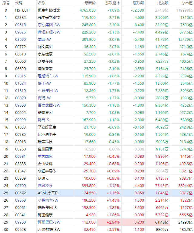 盘面上,明星科网股涨跌互现,美团跌3.07%,报201.8港元每股;哔哩哔哩跌3.13%,京东跌3.3%,快手、商汤跌近2%,小米、网易跟跌。阿里涨2.94%,报112港元每股;腾讯微涨1.12%,股价失守400港元关。