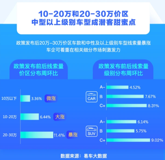 关于此次购置税减免政策的补贴范围,在此前的新闻发布会上,财政部税政司司长贾荣鄂表示,预计870多万辆乘用车可以享受优惠。而从车型来看,按照乘联会统计,此次政策要求的30万元以内2.0L以下车型的占比达到了总体零售的77%。可以说,与此前只针对1.6L以下的小排量车型相比,这次的政策明显更具有普惠的性质。至于哪一细分市场的刺激效果最为明显,易车的线索量数据显示,在政策发布后,20-30万价格区间的车型线索量环比增长11.4%,是增长最为明显的部分。
