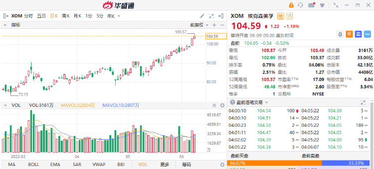 - 推动埃克森美孚股价连续走高的是紧张的原油供应市场。受俄乌冲突及需求扩大等因素推动,国际油价持续走高。周四交易时段,布油持续站稳120美元上方,WTI原油突破120美元大关。高盛经济学家此前预测,今年夏天原油价格将飙升至每桶140美元,因为俄罗斯产量下降和中国需求逐步复苏,将给本已低迷的供应增加压力。