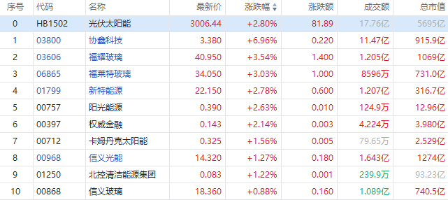 华盛资讯6月10日消息,港股光伏太阳能股午后拉升走高。截至发稿,协鑫科技涨6.96%,报3.38港元每股,成交额11.47亿港元;福耀玻璃涨3.54%,福莱特玻璃、新特能源涨超2%,阳光能源、信义光能跟涨。