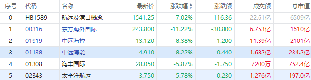 6月9日,港股的航运及港口概念股整体低开低走,截至发稿,东方海外国际跌11.22%,中远海控跌8.38%,中远海能跌8.22%,海丰国际跌5.87%,太平洋航运跌5.78%。